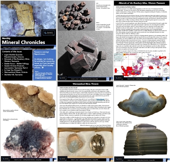 This month, in this 69 page full-colour issue, we have lots of pseudomorphs, a couple of Tasmanian mineral localities, Dealer Focus, a show report, showcase minerals in the Queen Victoria Museum, Launceston, Tasmania, and more. It includes: