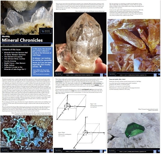 This month, in this 62 page full-colour issue, we have the following articles: Minerals from the Renison Bell Tin Mine, Western Tasmania; The Element of Surprise; The Johnson Mine, Cochise County, Arizona; Dealer Focus Alan Benson; Miller Indices; Collector’s Guide to the Minerals of Lake Boga Part 2